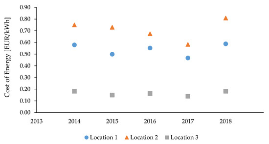 Figure 12 shows the trends in the costs of electricity generation over the period 2014–2018 at the three analyzed locations. Costs vary greatly depending on the location of the SWT, and Location 3 is clearly the most cost-effective. The cost is lowest at Location 3 for the five-year period analyzed, with an average cost of EUR 0.16/kWh, in contrast to average costs of 0.53 EUR/kWh and 0.70 EUR/kWh at Locations 1 and 2, respectively. The analysis shows that Location 2 is the most expensive-this can already be deduced from the value of the AEP index, which is the lowest of the three cases. We have the same cost assumptions for all locations, so if the least amount of electricity was produced in Location 2 during the year, then we get the highest cost of electricity generation per kWh.