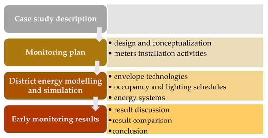 The activities included: (i) the detailed mapping of the exiting systems, both at apartment, building, and neighborhood level; (ii) the development of a detailed monitoring plan and its deployment with the integration of existing information and communication technologies (ICT) in the new multi-carrier EMS (Section 3); (iii) the creation of a dynamic simulation model for system performance evaluation and optimization (Section 4); and (iv) an early comparison between simulation output and energy monitoring data (Section 5). The paper summarizes the integrated approach used in the project (Figure 1), where dynamic simulation was used, trying to balance complexity and accuracy, as a tool to inform the monitoring plan, thus proving to be both a design and an operational useful tools, especially when neighborhood-level issues need to be challenged.