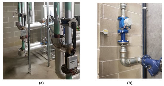 New installed measurements devices: (a) thermal meters installed on the heat exchanger (consisting in two temperature sensors, one ultrasonic flow rate sensor) and (b) volumetric flow rate meters, installed on the main water adduction pipe in each building.