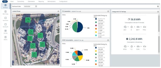 Cities consume about 75% of total primary energy and emit between 50% and 60% of the world’s total greenhouse gases [,]; a large share of it depends on buildings that, in the European Union (EU), represent about 36% of CO2 emissions and account for 40% of the final energy use [,,]. Any roadmap to decarbonization should therefore include sound solutions for the building stock management and renovation. As nearly 80% of the energy consumed by buildings refers to its operation, proper energy management may substantially allow the increase of buildings’ energy efficiency [,]. Single building interventions, although useful, are limited in their effects, and do not allow to maximize the benefits of sharing (costs, energy, etc.) among buildings. Micro-grids, connecting from a few buildings to a whole neighborhood, represent a technical option to enable the sharing of information and energy among buildings, providing a fundamental structure to promote waste heat recovery [,], energy communities and demand-response programs, but also to implement a remote control and management of buildings to decrease their energy use while enhancing occupants’ comfort. Intelligent buildings or smart buildings [,,], have been studied for a long time, and currently building management systems (BMS) are commonly applied also in residential buildings [,,,], at least in the form of remote monitoring and management. These advanced control systems boost building management, enabling communication between users and building appliances, through remote monitoring and control [,,]. The current challenge of applied research relates to the management of groups of buildings together, in order to improve the overall efficiency of a neighborhood and its integration with the city’s energy networks (power grid, district heating and cooling, data networks) [,]. This broad challenge includes a series of sub-challenges: (i) modeling the built environment to simulate the neighborhood energy dynamics [,,,], both for new constructions and for existing ones, (ii) planning an adequate monitoring and management, (iii) deploying the plan by integrating existing buildings with and energy management system (EMS), i.e., a platform allowing the visualization (dashboard) of monitored data, and some sort of control.