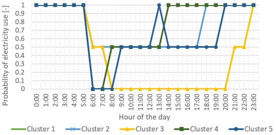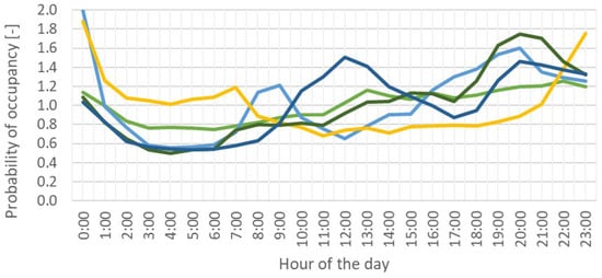 No building or city uses energy, but people do. Therefore, it is crucial to model correctly occupant behavior in building simulations, notably for the energy assessment of high efficiency buildings, whose behavior is highly depending on the users [,]. In this study the occupant behavior has been described by using stochastic schedules of occupancy and occupant-related electric energy use by lights and appliances have been used. The schedules have been developed using a data driven procedure, that enabled the identification of five clusters of daily probability of occurrence for the occupancy and five clusters of daily probability of occurrence for the appliances’ and lights’ electric energy use (Figure 5), by means of machine learning techniques applied on metered data of a residential building located in Milan []. The metered data are referred to a residential building which presents similar characteristics, apartments typologies and location (a suburban area of Milan) with the buildings hereby analyzed. The clusters, consisting in a daily hourly profile of the probability of occurrence of defined occupancy or energy uses, have been combined randomly to generate fifteen yearly annual schedules to be assigned to the modeled apartments. The profiles have then been multiplied for the average value of electric energy use and the number of people for each apartment typology. These values have been derived from the same database used for the profiles generation (Table 5) [].