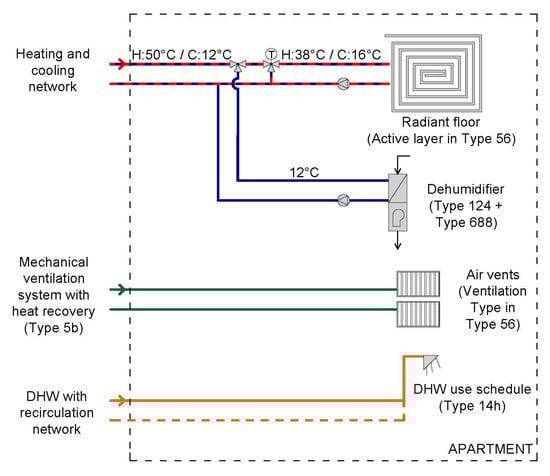 A general scheme of the system layout is reported in Figure 6. Each apartment is equipped with radiant floor panels for both heating and cooling, moreover a dehumidifier is installed for the humidity control during the cooling mode. Both the systems are fed by a building centralized network, which provides also the DHW. In addition, a centralized mechanical ventilation system guarantees constant air change rates to each apartment.
