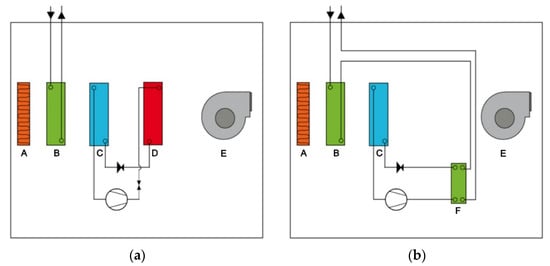 Functioning scheme of the dehumidifier REHOM 20L/G 1.3 (A = filter, B = pre-cooling coil, C = evaporator, D = air cooled condenser, E = fan, F = water cooled condenser). (a) mode with air condenser. (b) mode with water condenser.