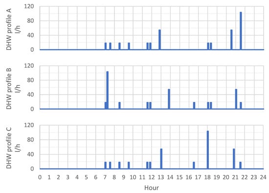 The DHW uses have been evaluated in a separated simulation with a timestep of 0.1 h, using three daily use profiles (Figure 8) corresponding to 36 L/day/person of DHW at 60 °C. These have been combined in stochastic manner with the annual occupancy profiles of each apartment. The DHW consumptions are obtained considering 15 °C as main water temperature and 55 °C as the actual temperature of the water delivered to each apartment. Moreover, the heat losses from recirculation pipes (Type 31) have been evaluated, in order to obtain the total energy consumed by the entire building for the DHW production.