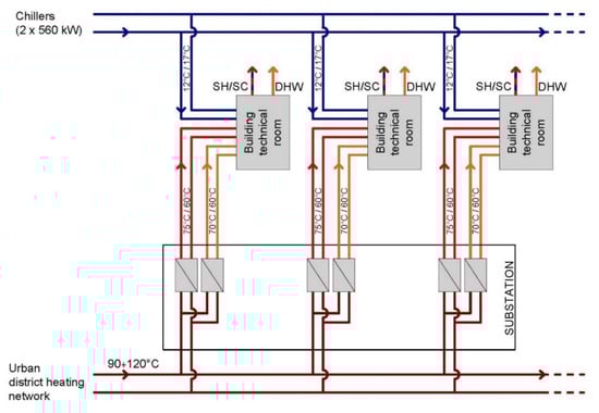 The urban district heating network supplies heat to three substations, where three couples of heat exchangers (one for the SH and one for DHW) are linked to the buildings’ technical room. These last are also connected to the cooling network of the district which is fed by two chillers. Figure 9 schematically reports a portion of the district network.