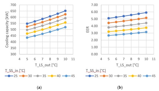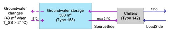 The district cooling network is fed by two groundwater source chillers CLIVET WSH-XSC 180F installed in parallel. Their cooling capacity is 560 kW/each at nominal conditions with load-side outlet temperature (T_LS_out) of 7 °C and source-side inlet (T_SS_in) at 30 °C. Groundwater is collected in a 500 m3 tank that periodically is partially depleted and refilled to maintain the temperature at the chiller inlet below 21 °C. The system scheme is reported in Figure 10. The tank has been modeled with Type 158; when the temperature at the chiller source side inlet rises above 21 °C a water volume of 43 m3 is changed. The two chillers have been modeled by Type 142 (water-cooled chiller), according to the performance maps derived by the manufacturer’s datasheet. The performance maps are two (Figure 11), in the first one the dependent variable is the cooling capacity and in the other one it is the EER (Energy Efficiency Ratio), while the independent variables are in both the cases the source side (SS) and load side (LS) water temperatures.
