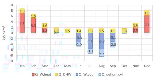 The monthly values of the energy supplied to all the apartments of the parcel under analysis are represented in Figure 12. The space heating energy (Q_W,heat) reaches the annual value of 23 kWh/m2/year (653 MWh/year), while the DHW production requires 18.5 kWh/m2/year (523 MWh/year). For the summer system operation, Q_W,cool represents the cooling energy supplied by the water systems (i.e., the radiant floor and the pre-cooling and condensing coils of the dehumidifiers), while Q_dehum,s+l is the cooling and dehumidification effect performed by the dehumidifiers’ refrigeration cycle. The summer load (both sensible and latent) is met by the combined action of these two systems. Q_W,cool is equal to 17.8 kWh/m2/year (505 MWh/year), while Q_dehum,s+l amounts to 7.9 kWh/m2/year (223 MWh/year). These results are consistent with benchmark energy needs of newly constructed buildings in compliance with actual energy saving regulations. There is no sharp predominance in the annual values for each use: 34% of the thermal energy needs are for space heating, 38% for space cooling, and 28% for DHW production. The latter value remarks that the DHW production gets importance in the framework of highly efficient buildings.