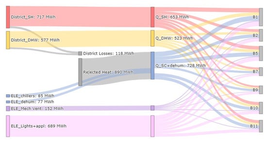 In Figure 13, a detailed representation of the energy fluxes in the parcel is reported via a Sankey diagram. According to the definitions of the European standard EN ISO 52000-1 [], the energy fluxes go from the delivered energy, whose energy carrier is specified as “District” (for the urban district heating) and “ELE” (for the electricity import), to the end users’ needs (grouped into the buildings “B#”). From the district heating network 1294 MWh/year are required; 55% is used for space heating (25.3 kWh/m2/year) and the rest for domestic hot water production (20.3 kWh/m2/year). The heat losses of the heating network in the parcel are also displayed, accounting for 4.2 kWh/m2/year, around 9% of the district delivered energy for the space heating and DHW production, thus the seasonal efficiency of the parcel network stands at 91%. The electrical uses for lights and appliances installed in each apartment are about 70% of total electrical consumptions (24.3 kWh/m2/year); whereas, among the electrical consumptions related to HVAC systems, about 50% is due to mechanical ventilation systems (5.4 kWh/m2/year). To guarantee the summer thermo-hygrometric comfort, a total electrical energy of 5.7 kWh/m2/year is required, shared between the consumption of the dehumidifiers of each apartment (2.7 kWh/m2/year with a seasonal EER value of 2.90) and the chillers (3.0 kWh/m2/year). For the cooling generation, in addition to the electric energy supplied and the cooling effect produced, the heat rejection is specified as the sum of the condensation heat of the dehumidifiers and the heat rejected by the chillers through the groundwater wells.