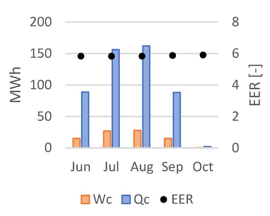 Monthly values of the chillers’ cooling energy (Qc), electric consumptions (Wc) and average efficiency ratio (EER).