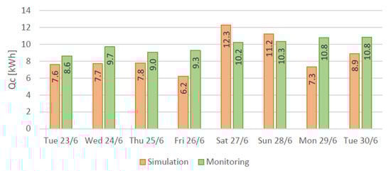 Comparison between simulation results and monitoring data of the cooling energy supplied to the network by both the chillers (Qc), in the period 23–30 June 2020.