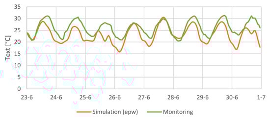 At the moment, the available monitoring data are limited to a short period at the end of June 2020. Figure 16 summarizes the daily values, from June 23rd to June 30th, of the cooling energy produced by the two chillers, and compares the monitoring data and the dynamic simulation results. The difference between the two series spans between +17% and −49%. From an overall analysis of the data, it can be noticed that some modeling assumptions can be among the reasons of those discrepancies; in particular, during the weekend the cooling energy need is overestimated by the model (+17% and +8%), contrary to weekdays (between −13% and −49%). In addition, the external weather conditions definitely play an important role, as highlighted by Figure 17, where the trend of the actual external air temperature is plotted against the weather file used in the simulations (“ITA_Milano-Linate.160800_IGDG.epw” []). On average the actual temperatures are 2.8 °C higher than the typical year represented in the epw file, used by simulations.