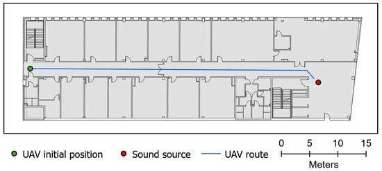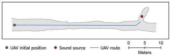 Figure 2). In both experiments, a UAV with a microphone located underneath has been approaching a person laying in the side pit of the main corridor and calling for help. In the preliminary experiment, an additional microphone has been used, which was placed near the help-caller. The person was located behind the corner, loudly repeated the words ‘HELP, HELP’. In the experiment performed in realistic conditions, a deep niche in the corridor has been selected as the ‘victim’s’ location. The volume of help-calling, as well as the speed of the drone, were kept as constant as possible throughout the whole experiment given the technical and organizational capabilities. Some minor variations in both speed and volume of acoustic emission could be caused by a human factor, as well as variations in the speed of airflow in underground excavations.