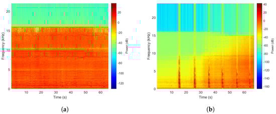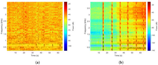 Figure 4 are records from both microphones. They illustrate the time-frequency decomposition of the sounds in terms of the log-scale PSD.