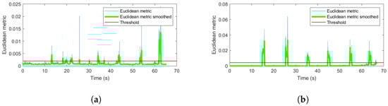 To discriminate between the human voice and the drone noise we set a threshold on Euclidean distance. Beforehand, we apply moving mean smoothing (with parameter