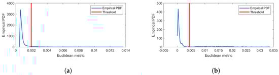 Figure 27c presents the Euclidean distance estimated for each spectrum. The threshold resulting from the PDF of such a measure is also plotted as a red line. Based on the proposed decision-making scheme, the final picture with detection results is presented in