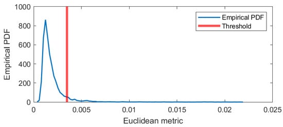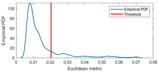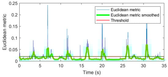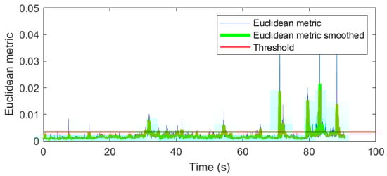 Figure 7. The Euclidean metric smoothed with 20 samples moving mean is highlighted in green. The red line stands for the threshold which we obtain as mode + standard error value from the empirical distribution of our metric on the whole time domain. The empirical density is presented in