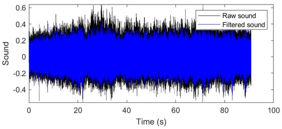 A particularly nonstationary behavior of the drone alone in the ending time interval (which is also audible from the record) was successfully removed due to band-pass filtering as it can be noted at the plot visualizing band-pass filtering of the raw sound (