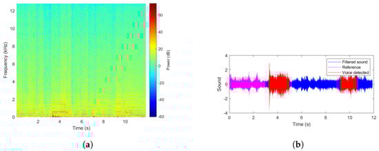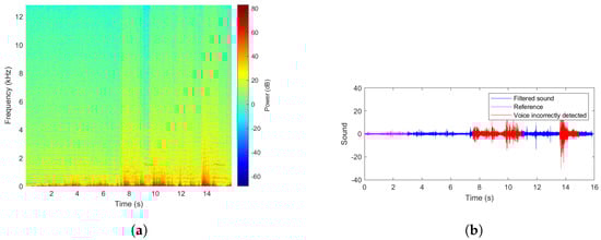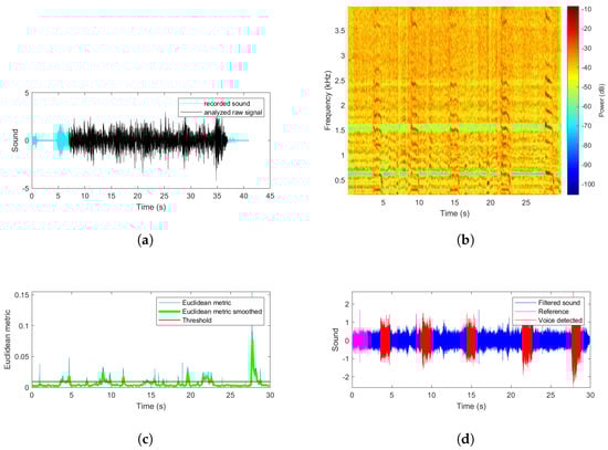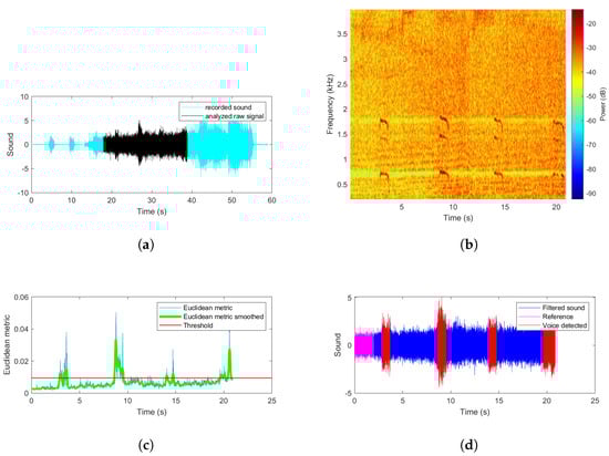 The core of this research work—the procedure proposed in the article—is relatively simple, as it hinges on the usage of typical time-frequency representation of the registered signal and comparison of its instantaneous spectrum with a reference spectrum that is known to not contain the signal sought, but only drone’s sound. It alludes directly to the novelty-detection approach, namely, if a spectrum emerges in the analyzed signal of an unknown or not expected structure, there is a high probability that it is related to an event of interest. Taking into account that during a rescue action, the presence of various noise sources is limited (due to the stopped machinery activity for instance), the abovementioned assumption can be found as legitimate. It should be underlined that what is of the highest importance is not a detected and distinguished specific human voice or a phrase, but rather, a quick and reliable segmentation of useful data (containing more than just a drone’s noise) from a big dataset created with the use of a team of microphone-equipped UAVs.