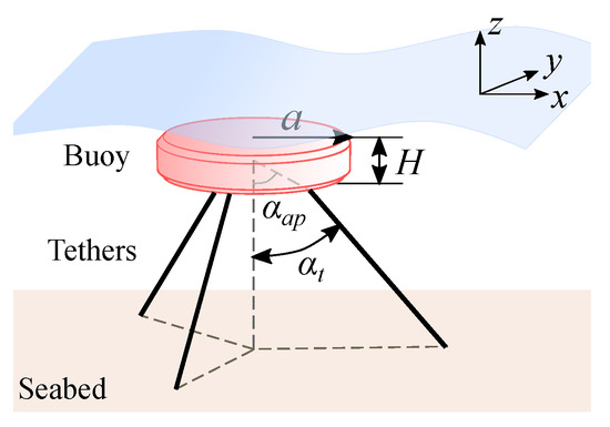 This study focuses on optimising a generic multi-mode wave energy converter that absorbs power from multiple degrees of freedom due to the arrangement of mooring lines. The buoy is positively buoyant, and three inclined tethers should always be under tension to keep it fully submerged. The power is generated using a rotary generator connected to each tether to convert the orbital motion of the WEC to electricity. A simplified sketch of the system is shown in Figure 1. The buoy sits 2 m below the sea water level, has a cylindrical shape, and its geometry is defined by a radius of a and a height of H. The angles and define how the tethers are inclined and attached to the buoy hull.