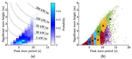 The Marettimo test site: (a) wave scatter diagram and (b) ten representative sea states identified using the k-means clustering method.