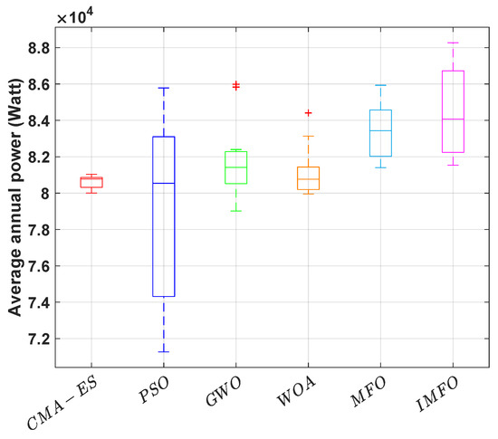 In the first step of this comparison for maximising the absorbed power output of the cylinder, each optimisation method was run ten times and the minimum, maximum and median of the best-found solutions are reported as a box-and-whisker diagram (Figure 4). In Figure 4, we can see that the IMFO could propose the best settings for the cylinder in terms of harnessing sea wave energy. Furthermore, the performance of the standard MFO is competitive and, in the following, the GWO performed better than the WOA, PSO and CMA-ES.