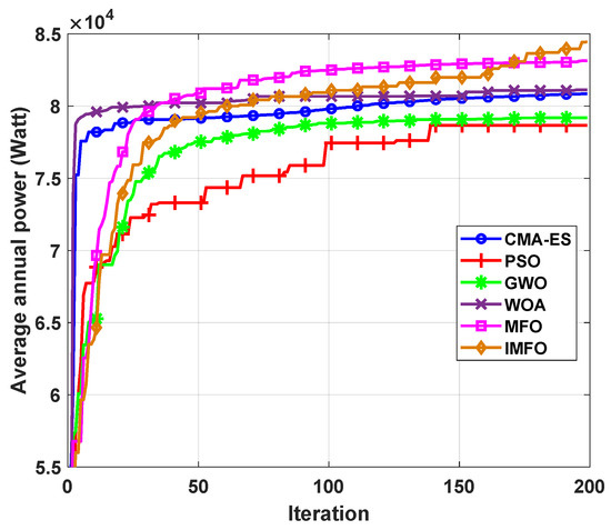 In order to provide deeper insight into the optimisation achievements, we compared the performance of the proposed optimisation method with other meta-heuristics, which can be seen in Table 6. In terms of the average best-found WEC’s settings, IMFO can perform substantially better than PSO by , and the percentage improvements of IMFO can be considerable compared with CMA-ES, WOA and GWO at , and , respectively. Furthermore, according to the best-found optimal WEC’s configurations, IMFO is able to outperform the standard MFO by .