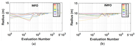 The sizes of the cylinder’s radius and height have a substantial impact on the power conversion from the converter. Figure 6 and Figure 7 show the process of the cylinder size optimisation using (a) the standard MFO and (b) the proposed MFO. Each line represents the search process of the optimisation algorithm, which is repeated ten times. As there is a semi-direct relationship between the radius and height size and the produced power output, both methods could converge rapidly and have approximately the same performance.