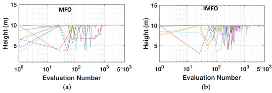 The searchability of (a) MFO and (b) IMFO in order to find the best inclination angle of the tethers ().