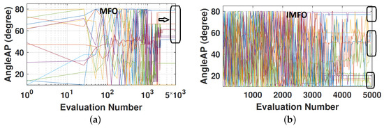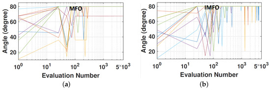 Furthermore, from Figure 8, we can observe that for both MFO and IMFO methods, after exploring the search space of the tether’s inclination angle (), most of the experiments are converged to the upper bound in order to absorb the maximum level of wave energy. It can be seen in Figure 8a that the standard MFO rapidly converged to a specific range (perhaps a local optimum) and was not able to keep the exploration ability. However, the proposed MFO kept its exploration searchability even among the last iterations (Figure 8b).