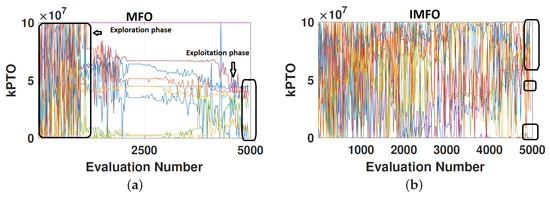 In Figure 10, we can see clearly that the best-found Kpto parameters using the MFO method are converged to less than . Nevertheless, IMFO proposed the values of Kpto in a wide range of search domains. As a result, these found Kpto configurations can produce more power compared with the MFO performance. Additionally, Figure 10b shows that the search space of the PTO parameters is multi-modal with highly dynamic behavior.