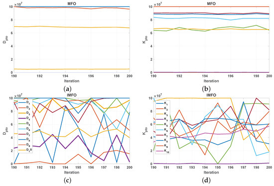 In order to clarify and provide an observable comparative landscape for both MFO and IMFO, Figure 11 is presented. To study the exploration and exploitation abilities of IMFO carefully and in great detail, the last ten iterations of the proposed method are plotted. We can notice clearly that the best-found configurations for both Kpto and Dpto using IMFO are distributed throughout the search space; however, the proposed settings of MFO are concentrated in a narrow range.