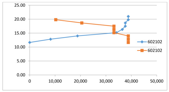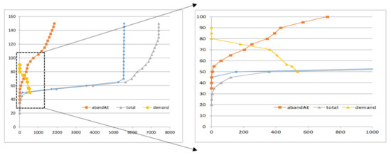 The supply curve generated previously by the agricultural model is plotted against demand to determine the market equilibrium. The market clearing process takes place simultaneously determining equilibria in each DMU (gmina). For the sake of illustration, we pick, in Table 6, observation for ten gminas. Each line contains data corresponding to one gmina (in column 1 code numbers from 060101 to 060210 gminas appear). In the first two columns (in yellow) quantity and price at the equilibrium, then in the next 3 columns the demand (curve), next the number of plants at the corresponding equilibrium point, and in the right part of the table, the supply (curve) at different price levels. Market clearing takes place in each DMU both for the units with installed plants and those that only provide biomass to the closest neighboring plants. To make this clear, we extract from Table 6 values of sorghum demand and supply at corresponding prices shown in Table 7. Market clearing determines the equilibrium at point (q = 30848, p = 14.91), that is also shown in Figure 6, the coordinates of supply and demand curves intersection.