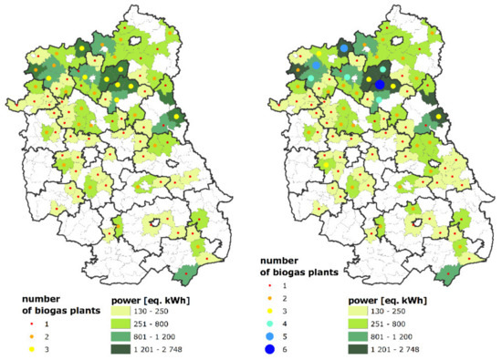 Despite the high number of farms included in the database, only holdings (cattle or pig farms or both cattle and pig farms) with more than 50 LSU per year, that is about 1% of all livestock producers in the Lubelskie province, were taken into account. As in Bartoli et al. [23] we have excluded farms with less than 50 LSU because in this case, the more realistic assumption for manure management is its direct application at the field level. For small farms, handling manure to centralized biogas plants is not profitable, due to loading and unloading cost and their limited surplus of manure available for biogas production. At the same time, we do not take into account micro-biogas plants (<130 kWe), since we assumed that the related energy production is almost entirely devoted to self-consumption at the farm level. The availability of manure calculated under these assumptions is displayed in Figure 1.