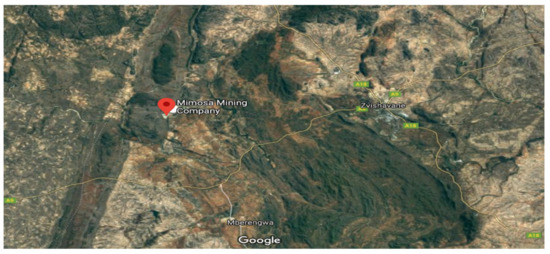 The Mimosa mine is a platinum group metal (PGM) and base metal mining company located in the Wedza sub-chamber of the Great Dyke of Zimbabwe (24 km west of Zvishavane town). The figure below (Figure 1) shows the geographical location of the Mimosa mine on the satellite picture (geographical coordinates with latitude −20.33 and longitude 29.83). The mine carries out underground mining and metallurgical plant processing activities and has an estimated life of 30 years. The output commodities of the mine include platinum, palladium, rhodium, gold, nickel and copper.