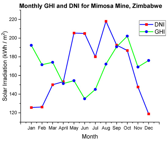 The Mimosa mine receives solar radiation of 2010 kWh/m2/year of DNI and 2034 kWh/m2/year of GHI according to the Solcast data. The DNI value shows that within the site it is technically feasible to develop CSP, as the minimum average value required is between 1900 and 2000 kWh/m2/year [32]. Figure 2 below shows the variation between the monthly GHI and DNI for the candidate site—the site receives higher DNI values than GHI between April and September.