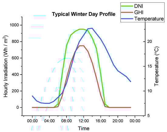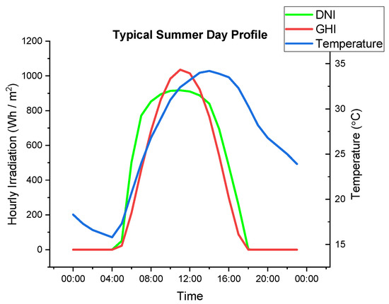 The two figures below (Figure 3 and Figure 4) show the typical hourly variation of DNI, GHI and the temperature during a day in summer and winter at the candidate site. For both figures, the GHI and DNI peak occurs around midday. The temperature in winter is below 25 °C which could help the PV system to perform better. However, the temperature in summer has a peak value of 35 °C which could affect the performance of the PV system.