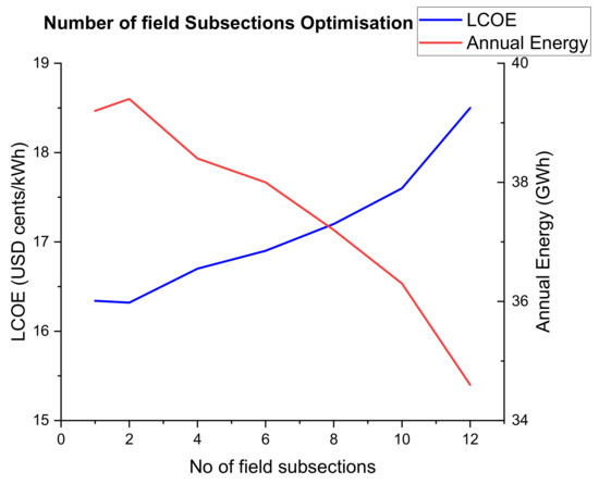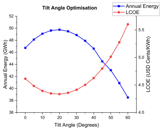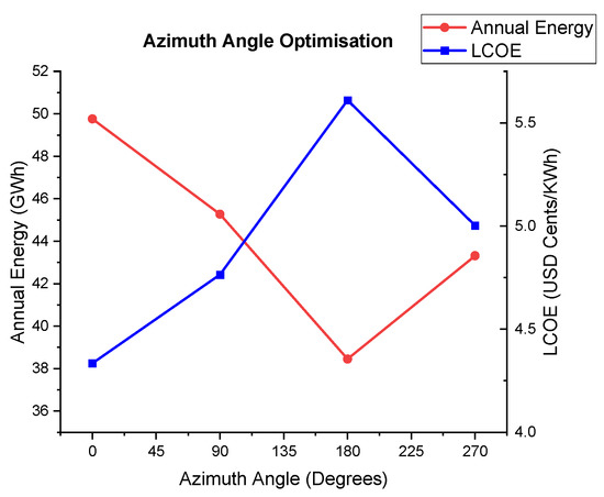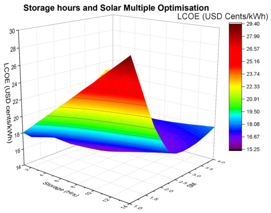 The curve for LCOE is a mirror image of the annual energy with its lowest value (US$0.048/kWh) at a tilt angle of 20°. The highest energy generated was found at an azimuth angle of 00 (North facing) and together with the lowest value of LCOE US5.50/kWh. The annual energy increases steadily up to a GCR of 0.45 where it starts to flatten out. At a GCR of 0.45 the interrow distance is about 2.4 m. The performance ratio of the plant is predicted at 77%. The predicted LCOE of this PV system is USD 0.048/kWh which is comparable to the weighted average LCOE of USD 0.045/kWh in other parts of the world. The 2 h storage battery has 3 PV sizes viable while the 12 h battery storage is only viable for 2 PV sizes. The expected capacity factor of the system is 18.6% with a performance ratio of 75% and a battery roundtrip efficiency of 92.7%. The losses resembled that of the modelled PV with the addition of the battery losses. As with the PV system, the most significant loss was the grid connection limit with a value of around 13%. The optimum solar multiple for the system is 1.25.