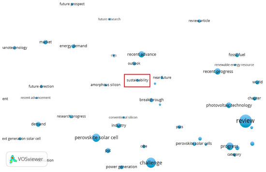 To date, sustainability has played a subordinate role in DSSC research. In order to visualize this statement, data from the Web of Science were evaluated using the VOSviewer tool. VOSviewer is a tool developed by Nees Jan van Eck and Ludo Waltman at Leiden University’s Centre for Science and Technology Studies (CWTS). With the software tool bibliometric networks can be constructed and visualized. With the text mining function co-occurrence networks of important terms can be visualized [28]. The search result for ’dye sensitized solar cell’ from the Web of Science returned 24,441 publications (15 March 2021). The titles and abstracts were exported and then evaluated using the VOSviewer tool. The results are shown in Figure 1.