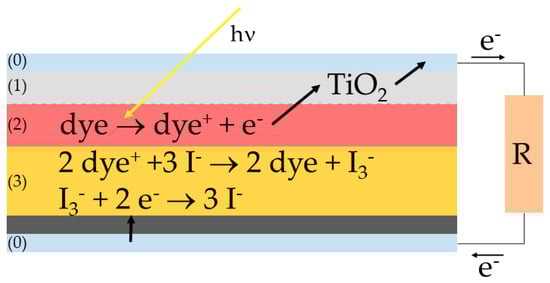 Figure 4 shows the schematic structure of a DSSC, which is briefly explained below. The basis for the DSSC, which is classically used in laboratories to investigate various properties of DSSCs, is two coated glass plates (0). A thin transparent conductive oxide (TCO) layer is deposited on the glass plates, referred to as the front and counter electrodes (0) [14,29]. The main task of these conductive semiconductor layers, which are transparent to visible light, is to transport the charge carriers generated in the cell by the internal photoelectric effect [14,29]. Light absorption and the resulting induced charge separation takes place in the dye molecules (2) [14,30]. These are often toxic ruthenium dyes. Anthocyanins are often used as a less effective, but cheaper and non-toxic alternative [14,29,30]. They are bonded to a semiconductor layer, e.g., titanium dioxide, which is located on the front electrode (1) [14,29,31]. For the regeneration of the dye, the redox reaction of an electrolyte, often based on Lugol’s solution, is used (3) [14,29,30]. Research is being conducted into liquid, gel-like and solid forms of the electrolyte. Solid and quasi-solid solutions have the advantage of being more durable than DSSCs with liquid electrolyte [14,29,30]. The catalyst layer is required for an effective regeneration process of the dye (4) [14,32]. Platinum enables DSSCs with the highest efficiency. Graphite is widely used as a lower cost and less toxic option. [14,32]. The catalyst layer is applied to the counter electrode. Here the electrons, taken from the DSSC, can re-enter and the electrical circuit is closed [14,32].
