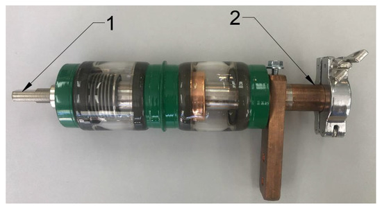 Research object—MV vacuum interrupter of special design: 1—movable contact adapted to mounting the interrupter in a laboratory stand, 2—fixed contact with connection for pumping channel.