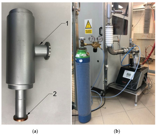 Test stand: (a) prototype of a vacuum interrupter designed to determine the actual pressure value in test objects (1—vacuum gauge connection, 2—pump channel connection), (b) view of the complete test stand.