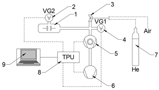 The laboratory station consists of a set of vacuum pumps (rotary and turbomolecular), a manual dosing valve and two vacuum gauges (VG1 and VG2). The system was connected to a laboratory computer network, so that through the TPU control unit it is possible to control the pumps and to read and record measurement results in real-time. The helium used in the study is contained in a secured cylinder with a valve and a manometer. A schematic of the laboratory station is shown in Figure 3.