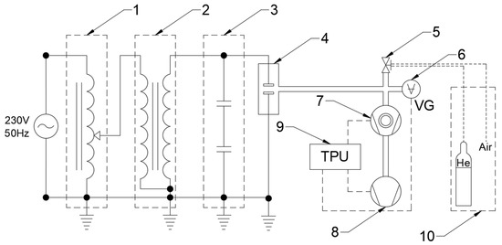 Scheme of test system for testing dielectric strength of MV vacuum interrupters (1—control panel, 2—power transformer, 3—capacitance divider, 4—vacuum interrupter under test, 5—manual dosing valve, 6—vacuum gauge, 7—turbomolecular pump, 8—rotary pre-pump, 9—system controller, 10—technical gases dosed to the inside of the tested object).