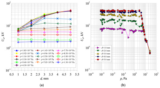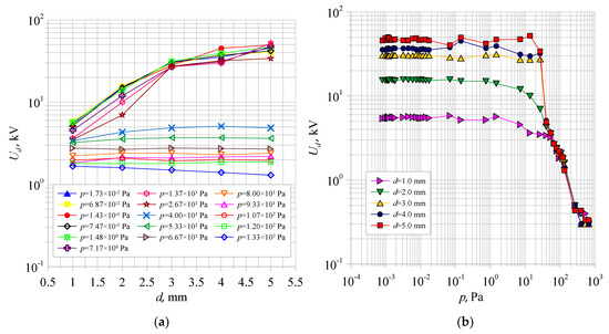 It can be observed in Figure 7a that, for pressures above a value equal to p = 4.0 × 101 Pa, it is apparent that electrode spacing has no significant effect on the value of the breakdown voltages. Below this pressure, as electrode spacing increases, the value of the breakdown voltage increases.
