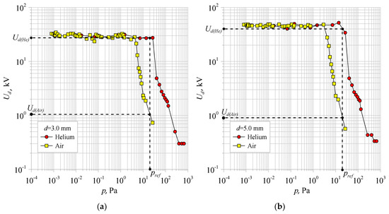 It is crucial from the point of view of the electrical strength of the vacuum interrupter to compare the measured values of the breakdown voltages Ud for different types of residual gases, i.e., air and helium. The characteristics of the Ud breakdown voltages as a function of pressure (air and helium) p for two electrode spacing were selected: 3.0 mm and 5.0 mm. The results are shown in Figure 8a,b.