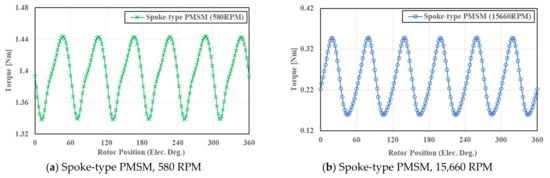 Figure 9, Figure 10 and Figure 11 are FEA results for torque ripple, loss, and efficiency at each operating point. The T-N curve shows the information that the spoke-type PMSM has a maximum operable speed of 15,660 RPM. On the other hand, the I spoke-type PMSM can use reluctance torque and can be operated at 18,000 RPM or higher. Therefore, Table 3 provides torque ripple, loss, and efficiency results of 580 RPM and 15,660 RPM for spoke-type PMSM and torque ripple, loss, and efficiency at 580 RPM and 18,000 RPM for I spoke-type PMSM.
