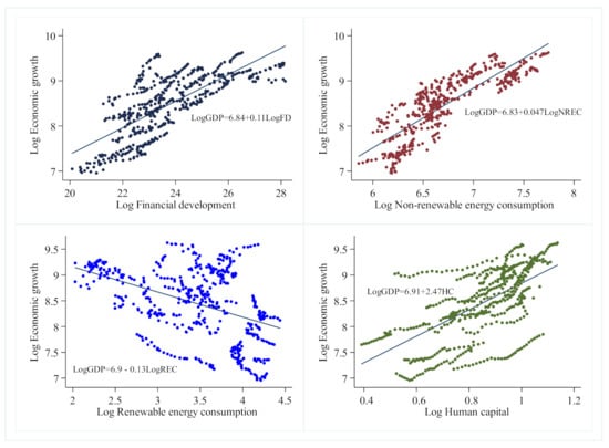 Several theoretical and empirical studies have been published in the economic literature that explain the effect of financial development, non-renewable energy consumption, renewable energy consumption, and human capital on economic growth. Abubakar et al. [3] reveal that financial development contributes significantly to economic growth in the Economic Community of West African States (ECOWAS) region, either directly or through human capital. In contrast, Shahbaz et al. [4] recommend that implementing an investment climate and improving human resources will foster economic growth, given that sustainable and unsustainable energies incentivise economic growth in a sample of 38 renewable-energy-consuming countries. First, the literature emphasises that financial services are the main engine of economic growth, being important for innovation and productive investment [5]. In addition, studies such as Boukhatem and Ben [6], Ali et al. [7], and Pradhan et al. [8] prove that financial development contributes positively to economic growth, indicating that finances help improve families’ standard of living. Another line of studies indicates that the consumption of non-renewable energy is a key input for economies worldwide since it plays a major role in the level of production and holds a key place in consumer spending [9]. In this regard, the higher the non-renewable energy consumption is, the higher the economic growth, with a high spread of contamination in 193 countries [10]. In this sense, limiting this type of energy will exacerbate growth [11]. Therefore, polluting energy is crucial for economic growth, and economic growth also drives polluting energy consumption in emerging market and developing economies (EMDEs) [12]. Similarly, the literature assumes that renewable energy is a strategic element that is positively related to economic growth and sustainable development. For example, Alvarado et al. [13] show that sustainable energy has a positive effect on economic growth in Latin American countries. Likewise, for D8 countries, Mahjabeen et al. [14] find that renewable energy has a strong positive association with economic development. Consequently, removing financial and political obstacles are important paths towards the deployment of renewable sources [4]. Finally, there is strong evidence suggesting that human capital accumulation has a beneficial effect on long-term economic growth [3,15].