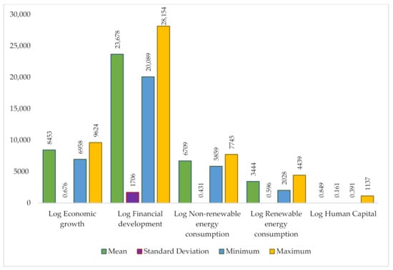 The data used in this investigation of GDP per capita (USD at constant 2010 prices), internal credit to the private sector (USD at constant 2010 prices), non-renewable energy consumption (Kg of oil equivalent per capita), and renewable energy consumption (% of total final energy consumption) were obtained from the World Development Indicators database [42] of the World Bank. The human capital index was obtained from the Penn World Table [16], version 9.1 database of the Centre for Growth and Development of the University of Groningen. These variables were selected according to the previous literature review since there are no studies that have considered these variables together in their analyses. Therefore, for the econometric regressions, per capita GDP as an economic growth indicator was considered a dependent variable, and domestic credit to the private sector as a proxy for financial development was considered an independent variable, given that it is the main source of financial intermediation for savers and investors who channel the private sector in developing countries; three control variables were also included: non-renewable energy consumption because it is the main input to decide the degree of production of goods and services in a country; renewable energy consumption since it comes from clean and inexhaustible resources that help mitigate climate change and guarantee sustainable economic growth; the human capital index since it is a fundamental factor of knowledge and skills that individuals acquire through education that allows improving the workforce. On the other hand, the research analysis covered 16 Latin American countries that have data available for the five variables for the period 1988–2018: Argentina, Bolivia, Brazil, Chile, Colombia, Costa Rica, Ecuador, Guatemala, Honduras, Mexico, Nicaragua, Panama, Paraguay, Peru, Dominican Republic, and Uruguay. In addition, the data of all the variables were transformed into logarithms in order to reduce the measurement heterogeneity of the variables. Following this, Table 1 shows the description of each of the variables used in the econometric models.