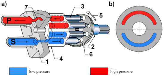 Axial piston pump with plate commutation unit [12]: (a) cross-section of the pump; (b) commutation plate; P—high-pressure pumping channel; S—low-pressure suction channel; 1—manifold; 2—shaft; 3—piston; 4—cylinder block; 5—slipper; 6—swashplate; 7—commutation plate.