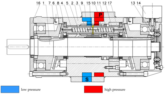 Axial piston pump with cam-driven commutation unit (PWK) [12]: P—high-pressure pumping channel; S—low-pressure suction channel; L—leakage channel; 1—shaft; 2—body; 3—socket; 4—piston; 5—spiral choke; 6—slipper; 7—swash-plate; 8—separator plate; 9—commutation tube; 10—cam slipper; 11—cam; 12—adjustment shaft; 13—gearbox; 14—adjustment motor; 15—compensation tube; 16—cover; 17—guiding tube.